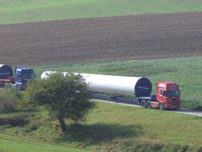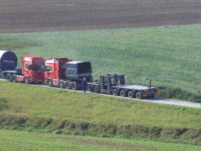Die erste Gondel ist abgeladen Ein leerer Schwertransporter vor der Heimfahrt